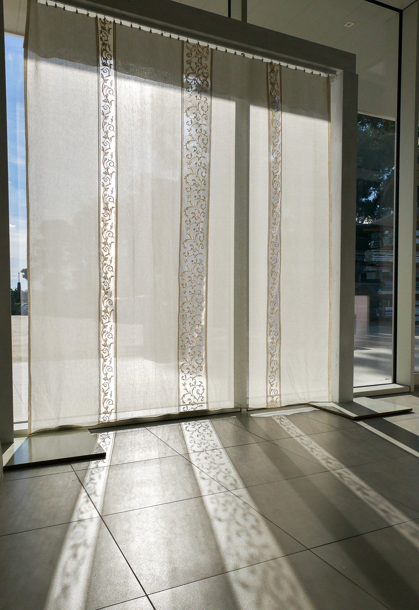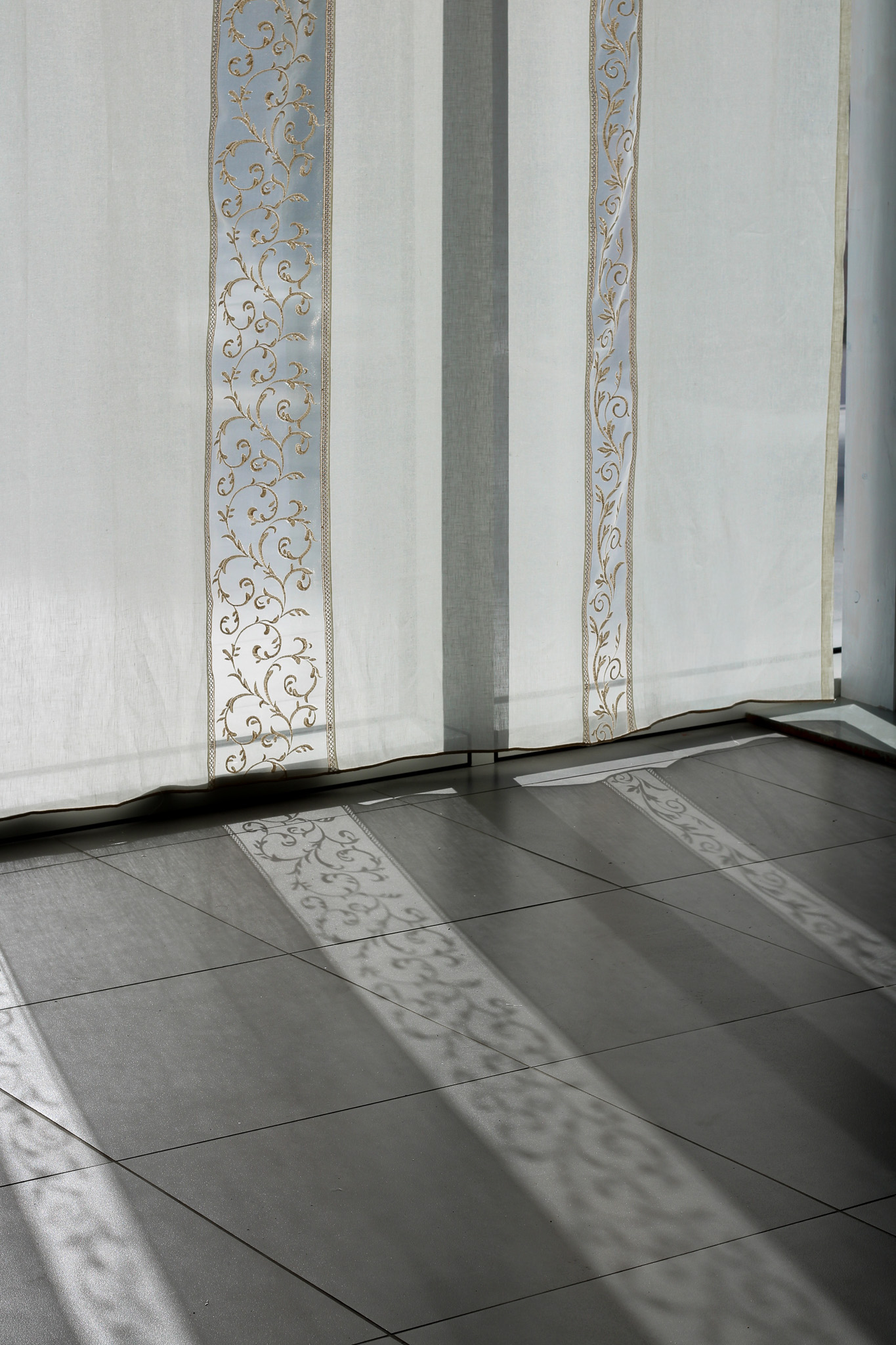 Il ricamo, elegante e discreto, crea giochi di luce che rendono l’ambiente arioso e accogliente.